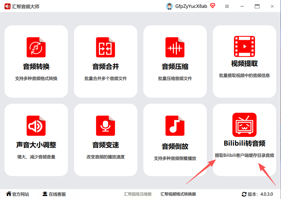 1. 打开汇帮音频大师,在主界面里找到“bilibili转音频”这个选项,点进去