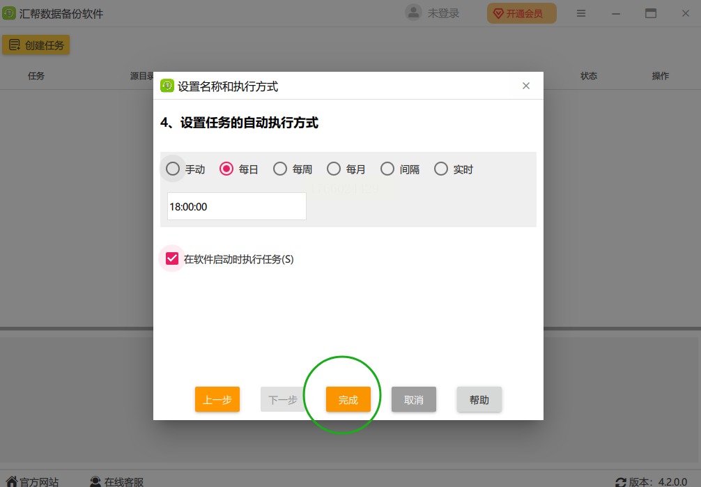 7. 检查设置,完成任务:最后再看一遍所有设置,确认源文件夹、目标位置和时间都没错,然后点"完成"。