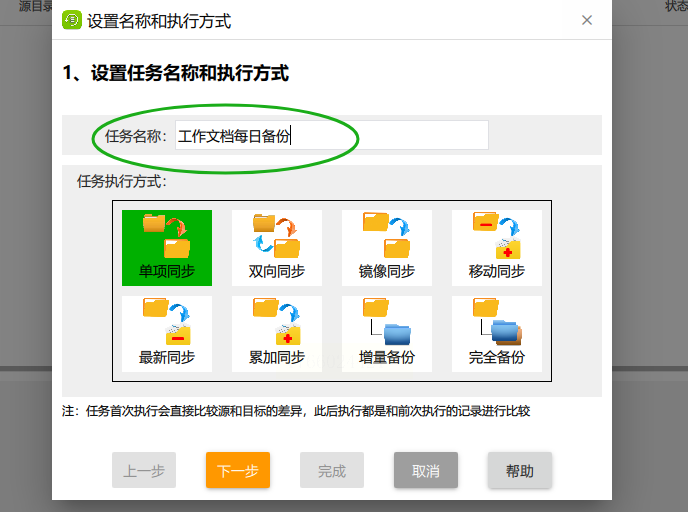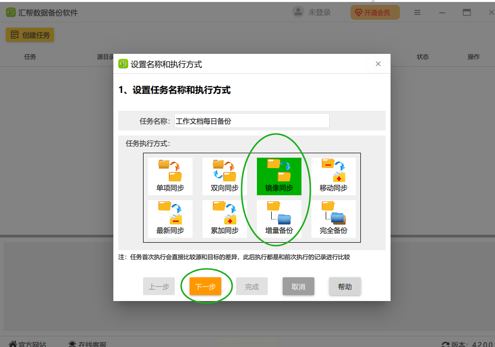 3. 选择备份模式:这里有"增量备份"、"全量备份"和"镜像同步"。新手选"增量备份"就行,它只备份变化的部分,省空间又快;如果是重要文件且空间够,选"镜像同步"更保险,能确保目标文件夹和源文件夹完全一致。