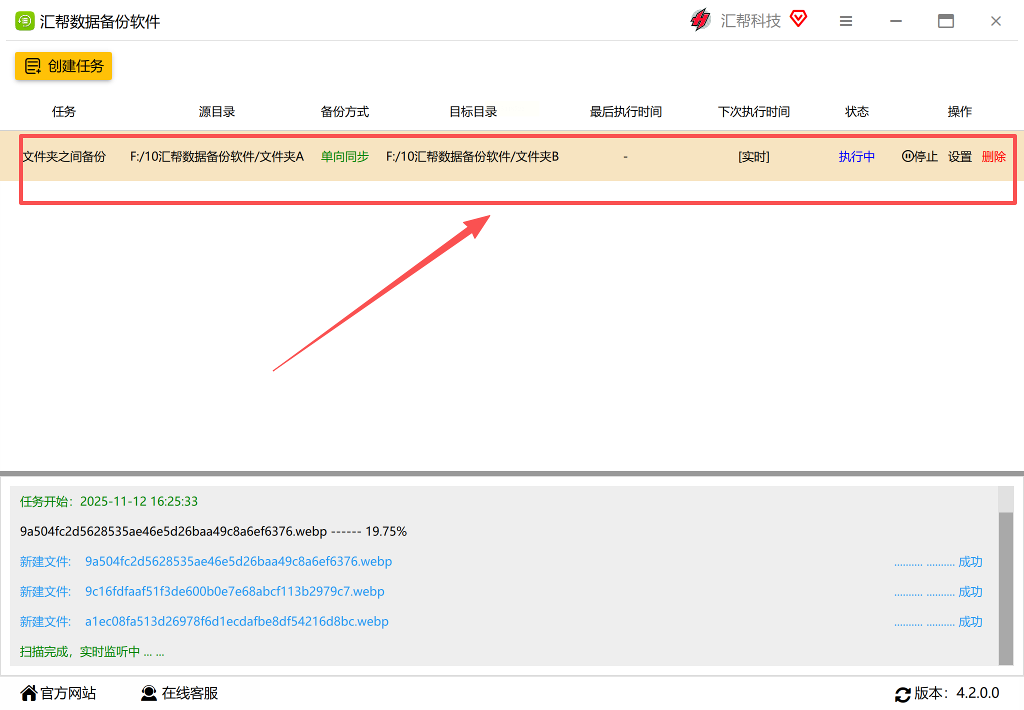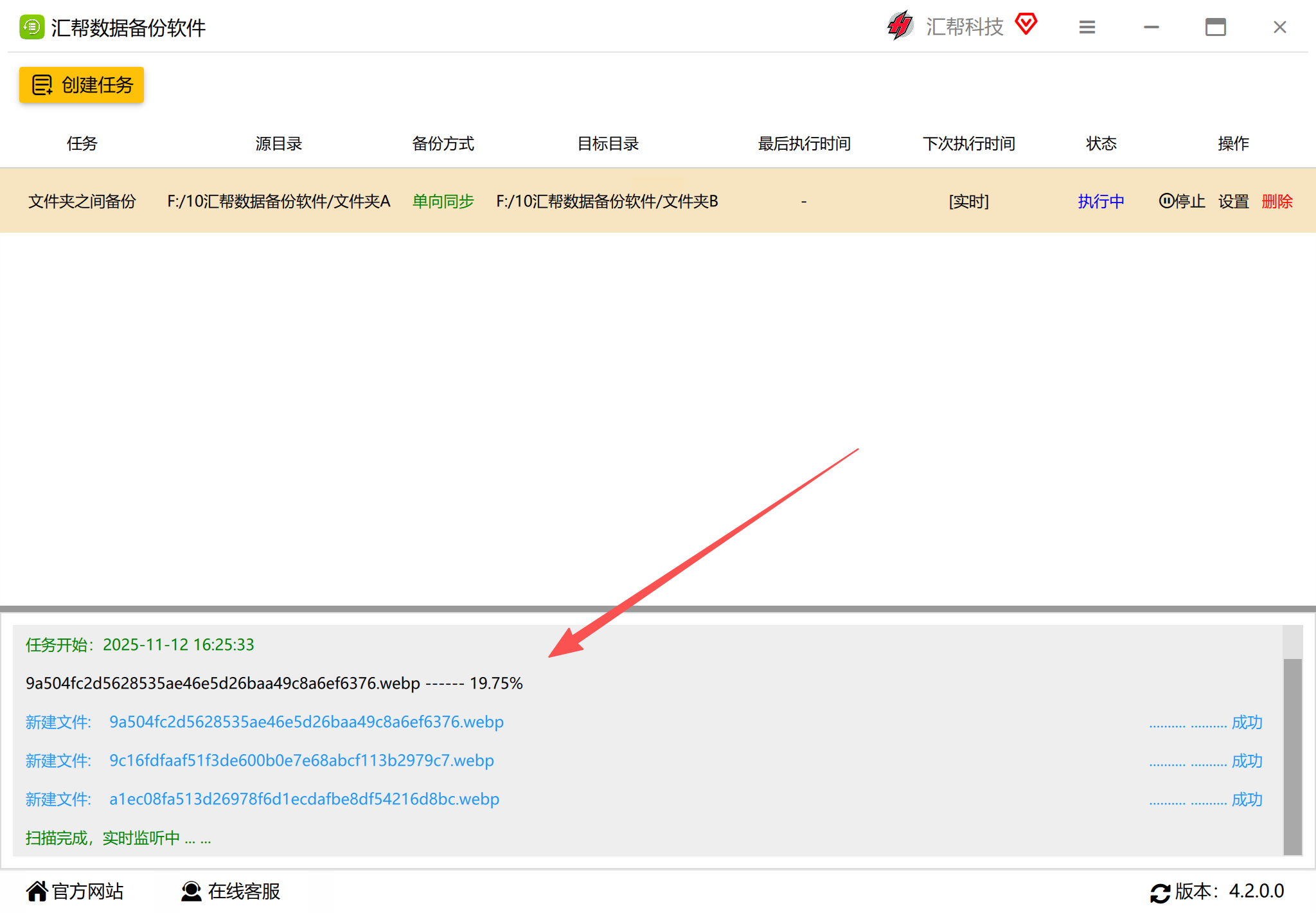 点击「完成」后,软件会生成一个任务列表。此时打开源文件夹,放入一个测试文件(比如“测试.txt”),软件会立刻显示“备份中”,目标文件夹也会自动出现这个文件。