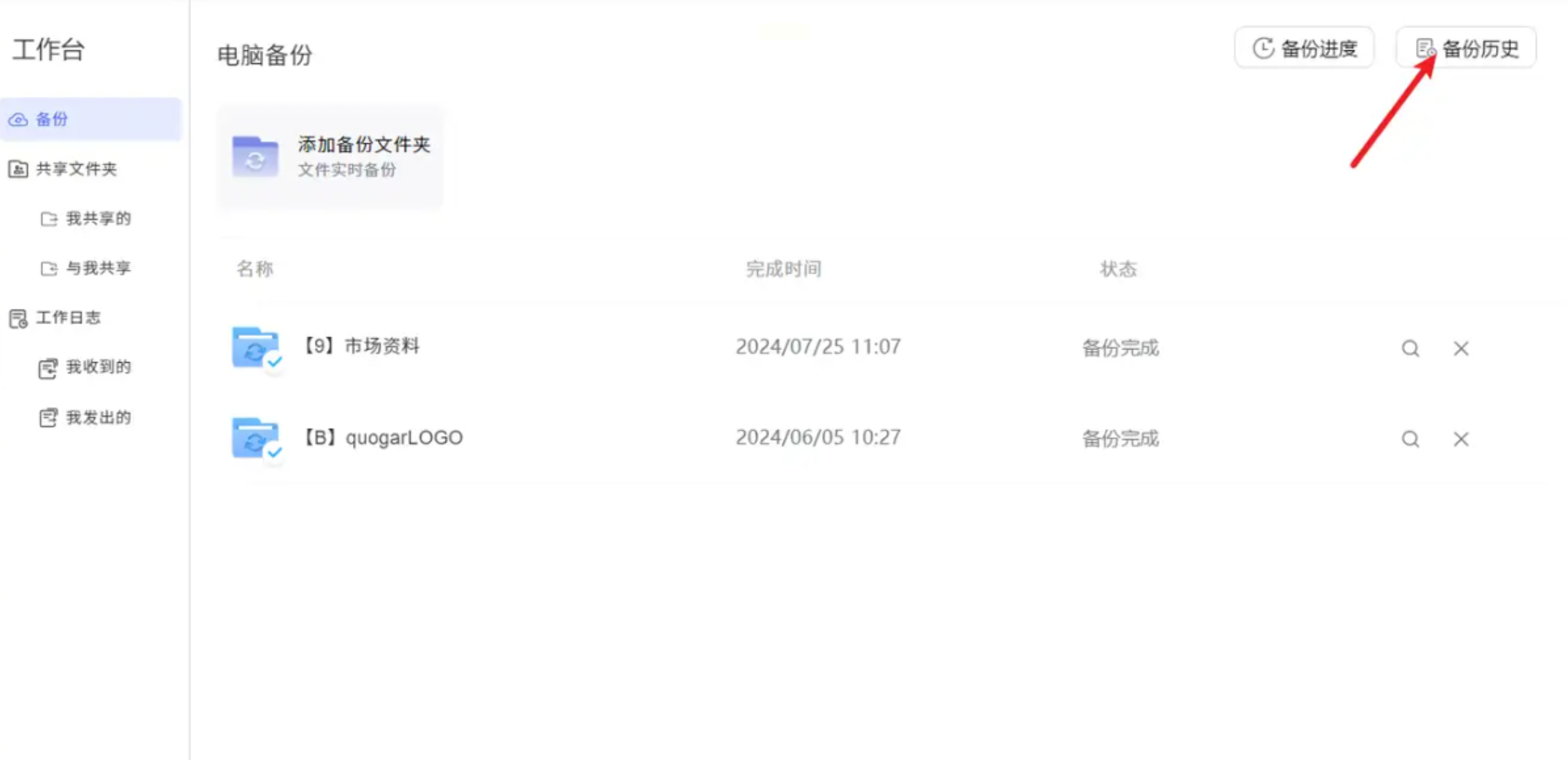右上角有「备份历史」按钮,点击后能看到所有文件的备份记录,包括时间、文件大小、修改内容等,误删文件时直接从历史记录里恢复。