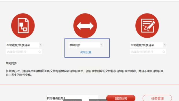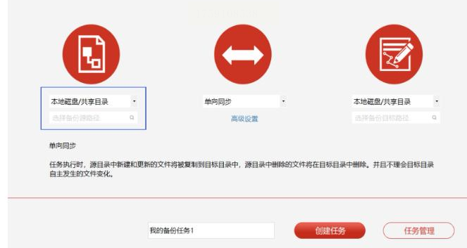 2. 创建备份任务:打开软件后,点左上角的【创建任务】按钮(这个按钮很好找,颜色比较显眼)。在弹出的窗口里,先给任务起个名字,比如“工作文件自动备份”,这样以后找任务也方便。然后在功能选项里选“单项同步”(这个最常用,就是把源文件的变化同步到目标位置,简单好理解),点【下一步】。