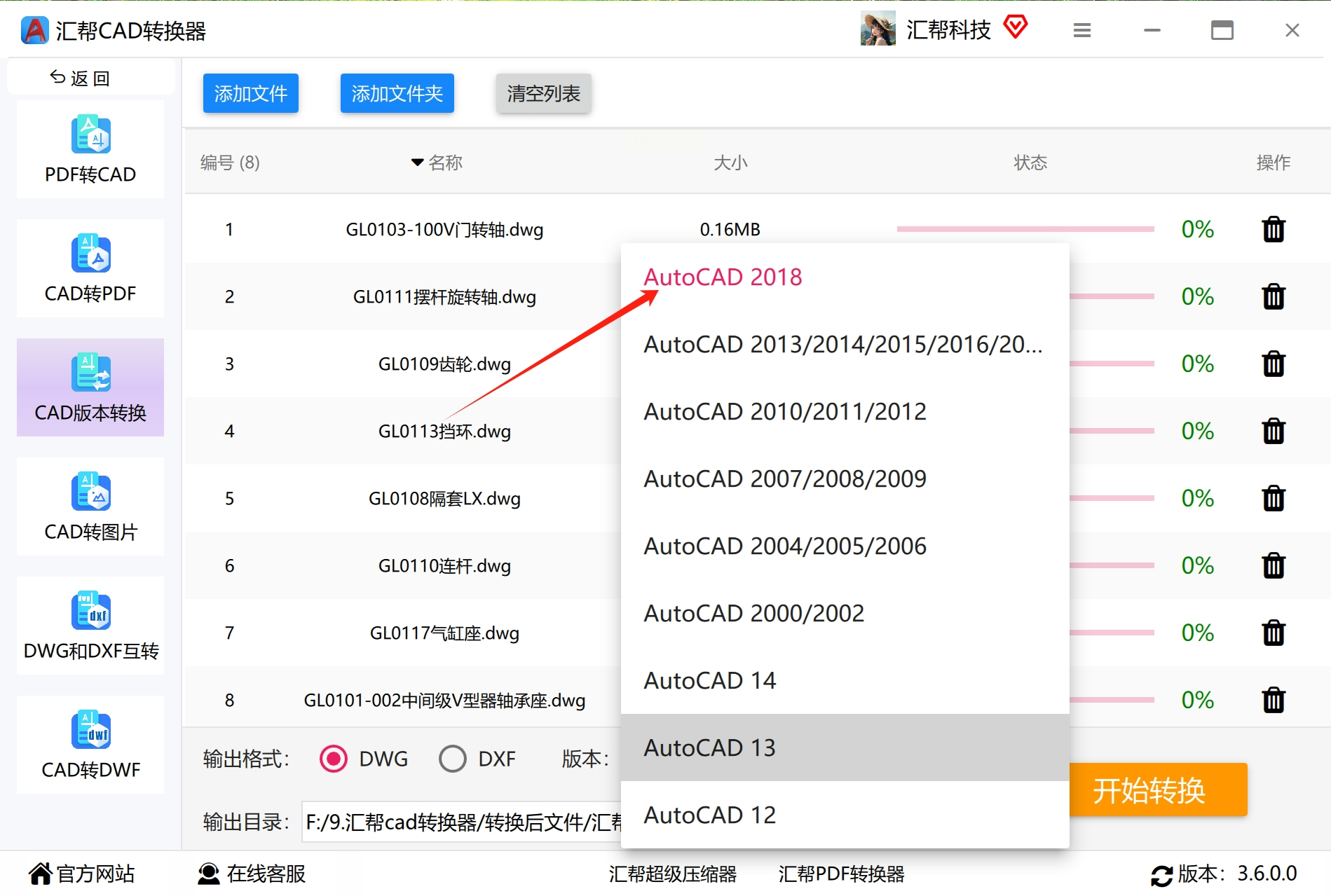 4. 设置目标版本:在下方版本列表里,选好要转换的版本(比如“AutoCAD 2018”或“AutoCAD 2004”),这里可以批量统一设置。