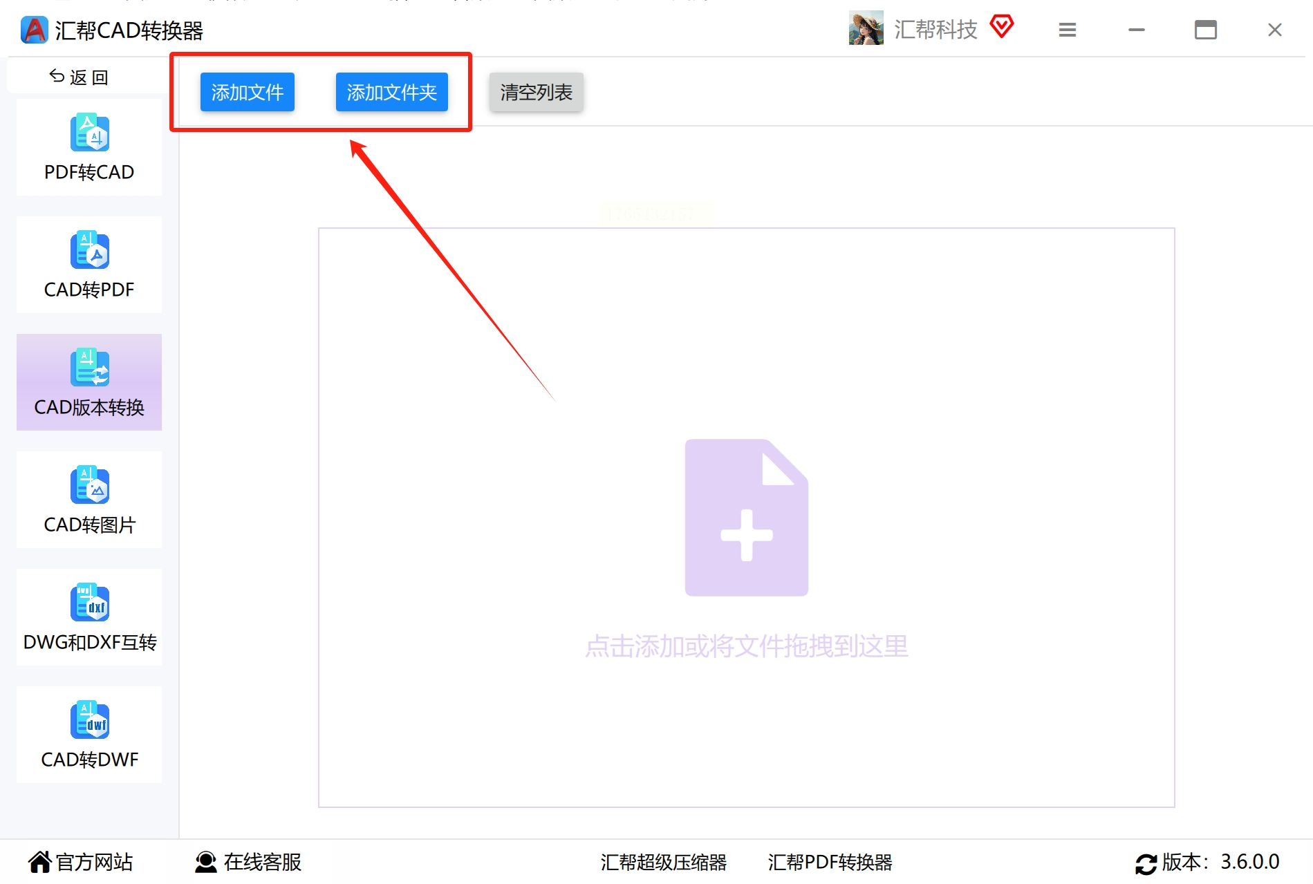 2. 上传文件:点“添加文件”或“添加文件夹”,把需要转换的dwg文件丢进去,支持同时转换多个文件。