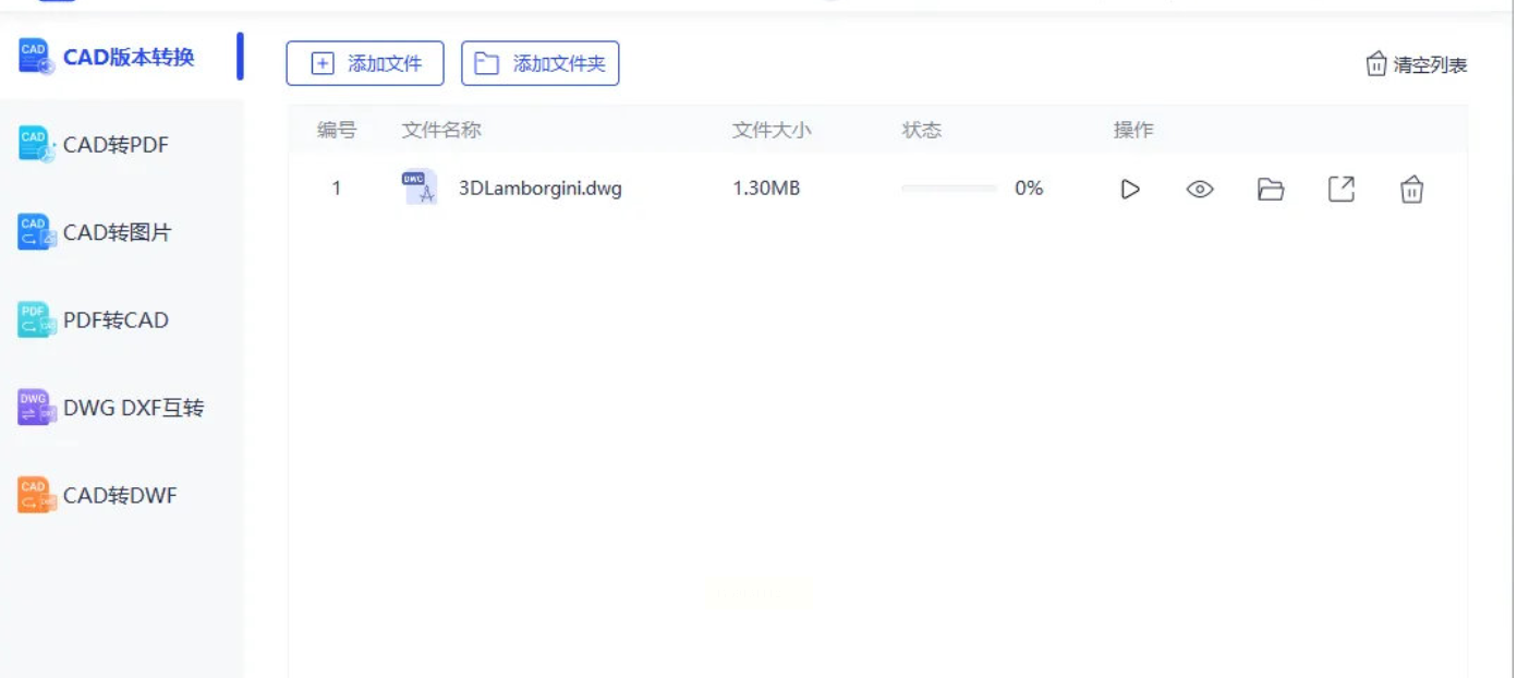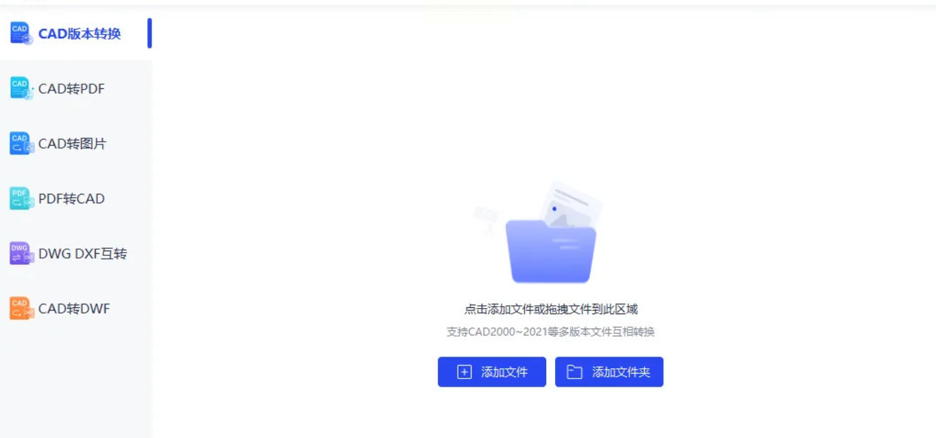点击“添加文件”按钮,选择单个DWG文件;如果需要批量转换,可以点击“添加文件夹”,一次性导入多个文件。