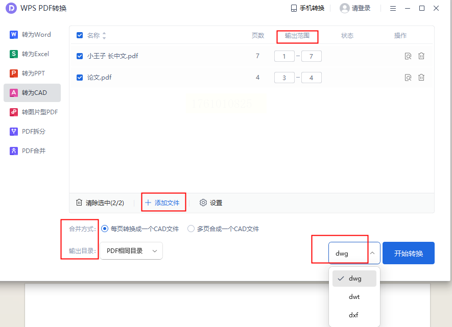 步骤二:在跳转界面中直接选择PDF转CAD功能,支持单个或批量文件上传。输出格式通常无需调整,但可以按需设置转换页面范围。