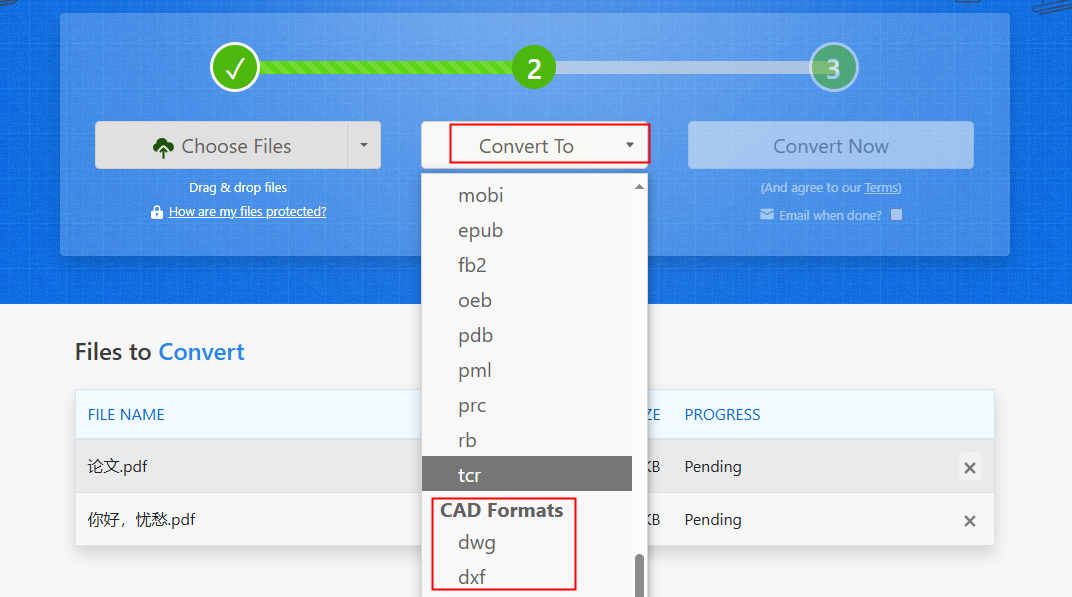 步骤二:它支持把多种文件转成DWG或DXF,可以一次上传多个文件。