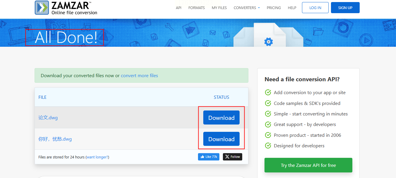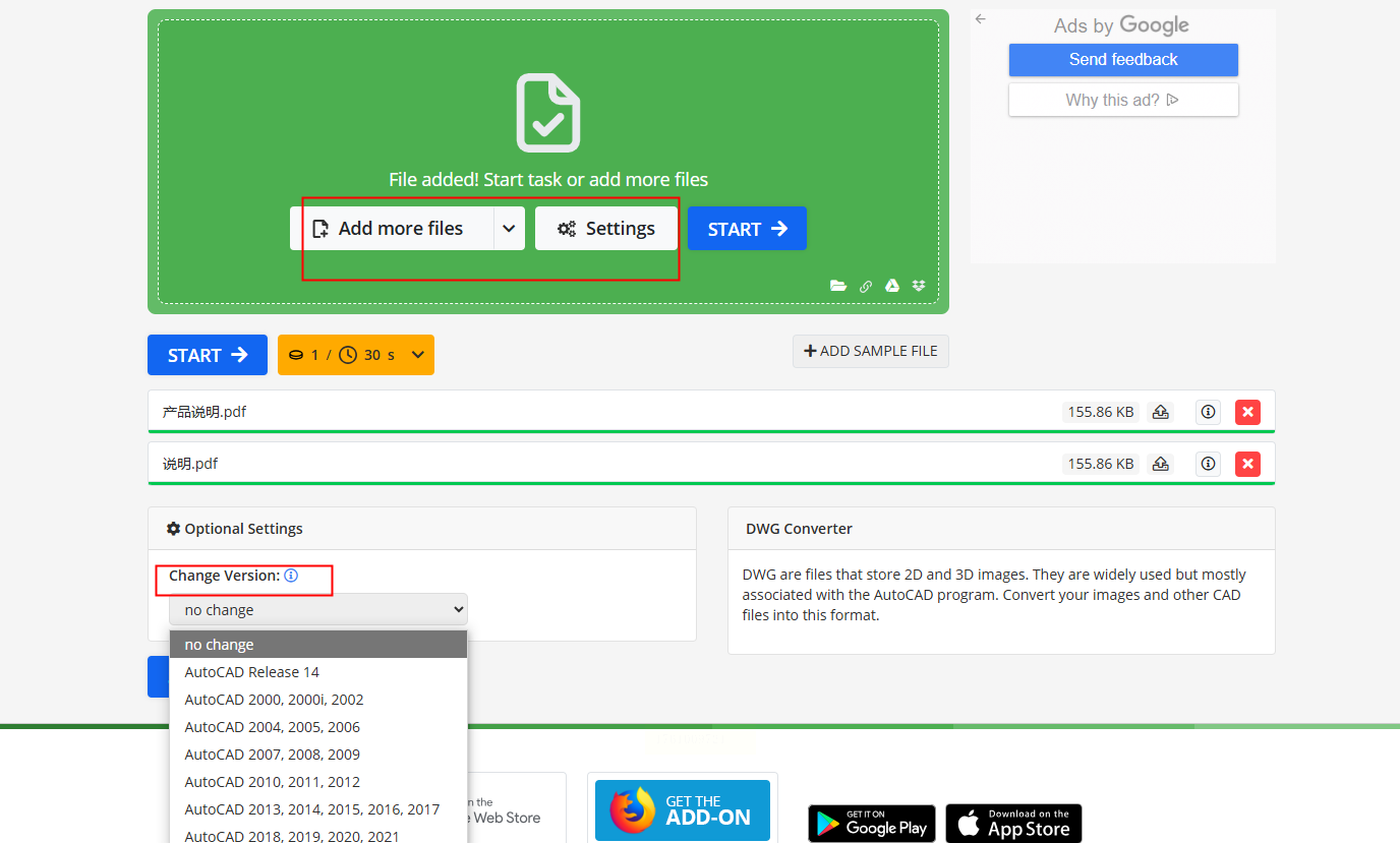 步骤三:根据需要选择是否转换CAD版本,然后按“START”开始转换。完成后直接下载。
