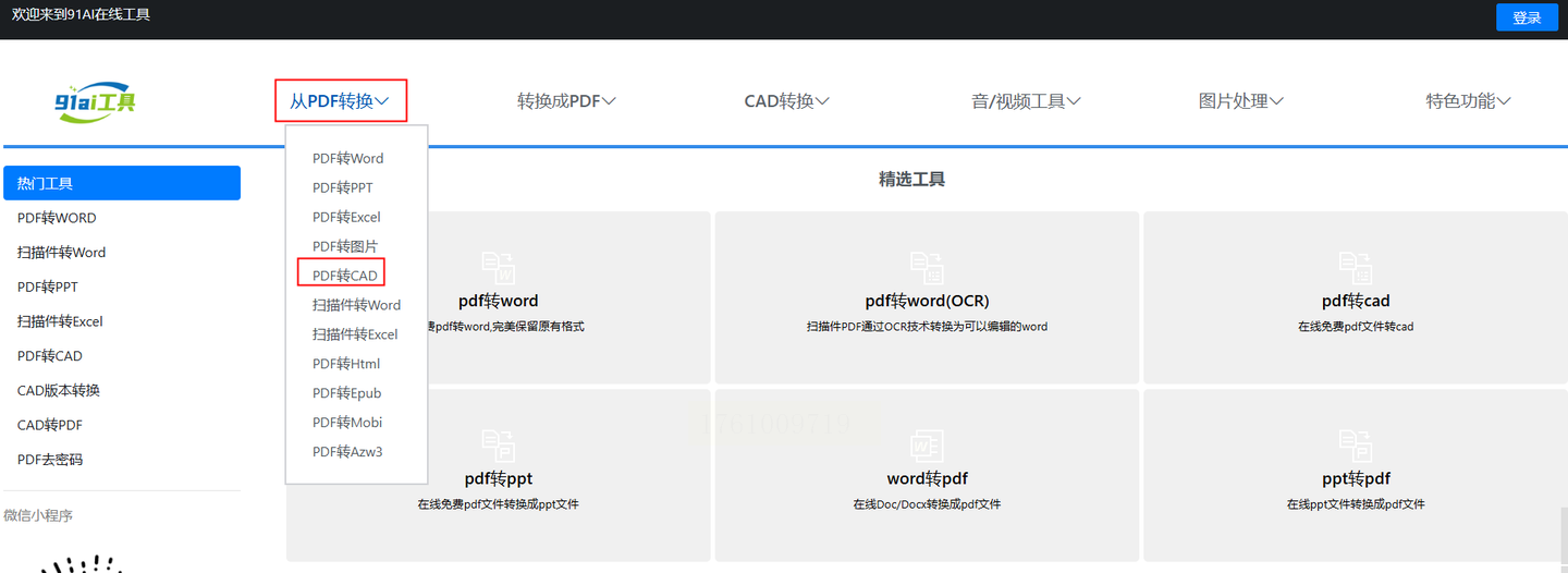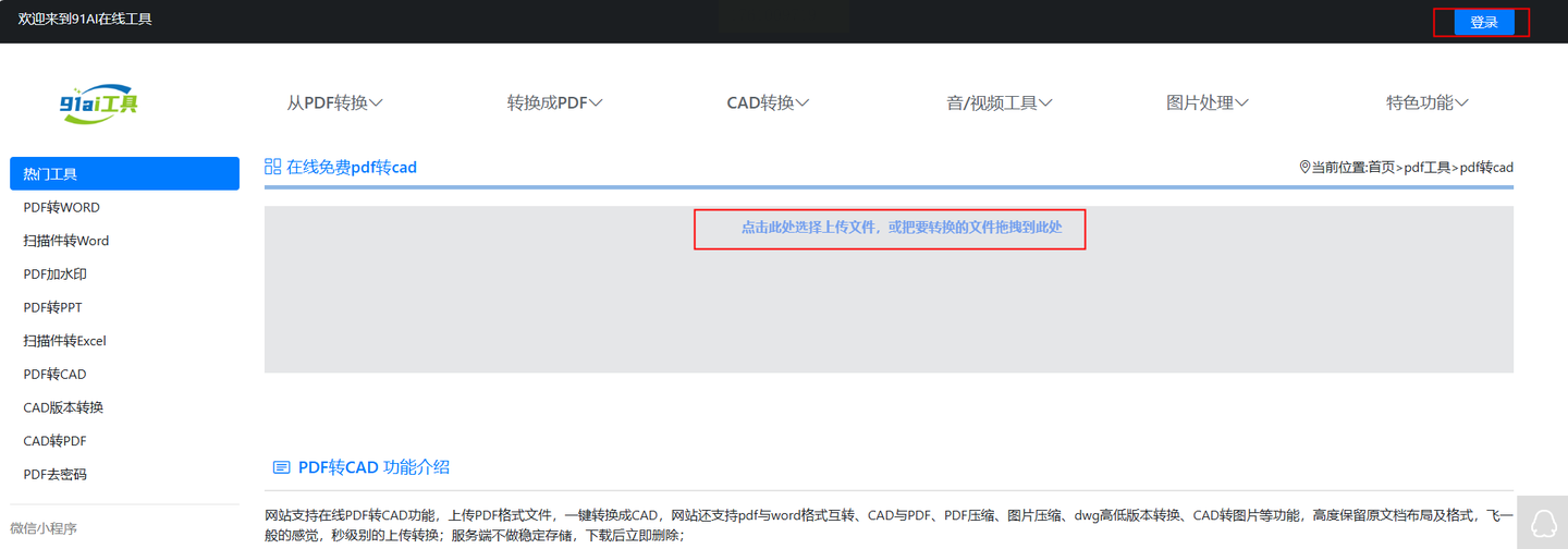 这是一个集成多种文件处理功能的在线平台,PDF转CAD是其中之一。使用前需要扫码登录。
