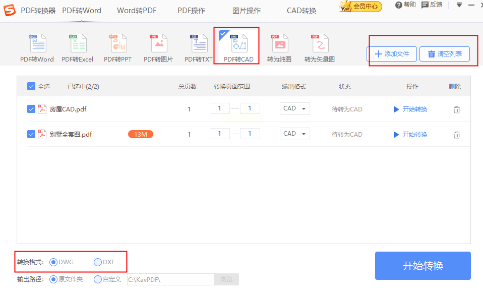 步骤三:文件加载后,在下方选择输出格式,DWG或DXF都可以。接着选好保存位置,如果没选,默认存到桌面。最后点“开始转换”。
