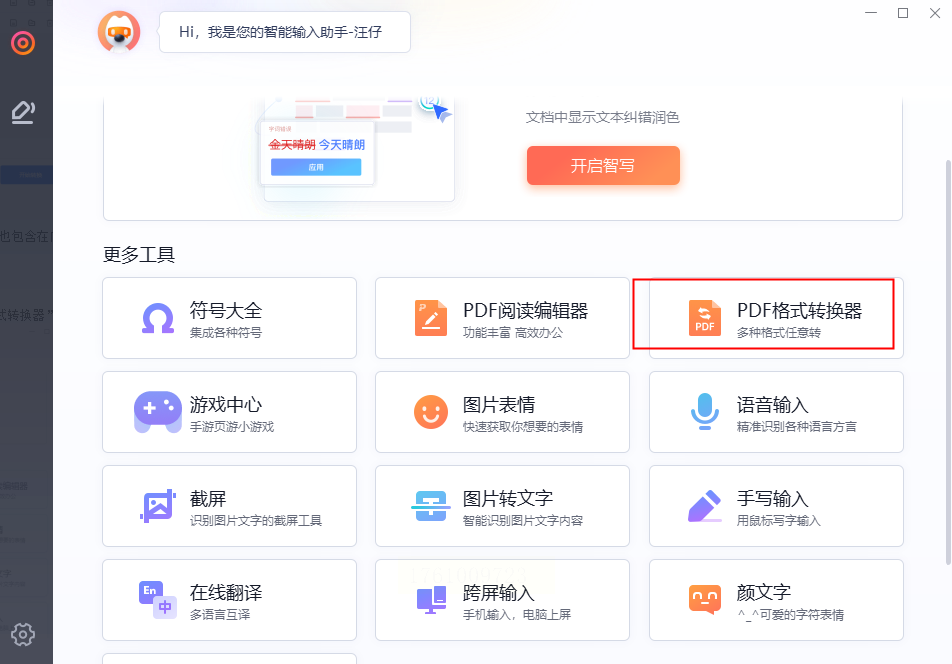 步骤一:调出输入法的悬浮框,找到“智能输入助手”,进入后选择“PDF格式转换器”。