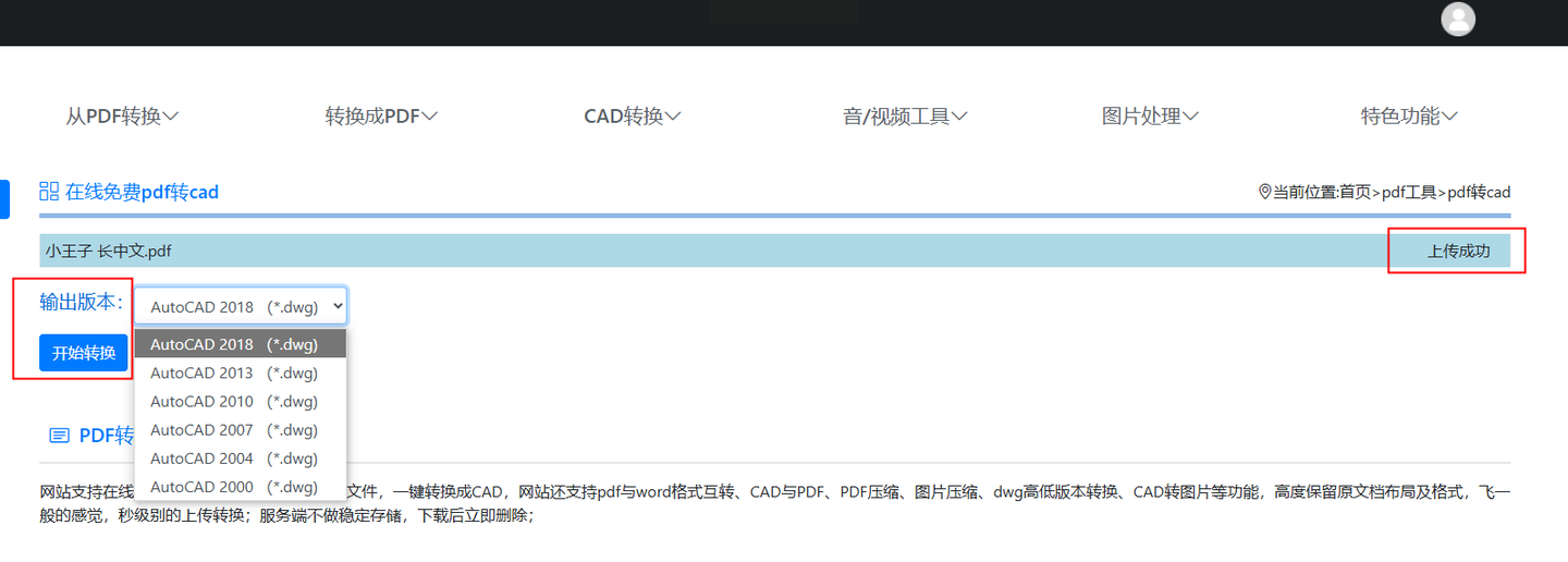 步骤三:文件传好后,选择输出的CAD版本,点击转换。完成后下载即可。网站会在转换后删除文件。