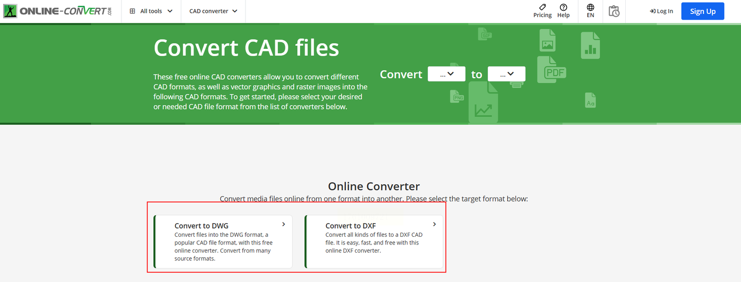 这个网站支持非常多的文件格式转换,包括CAD相关格式。界面语言可选,也可以用浏览器翻译成中文使用。