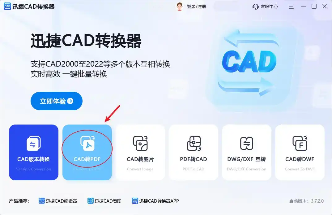 首先,去官网下载汇帮CAD转换器并安装到电脑上。打开软件后,你会看到清晰的功能界面,直接点击"CAD转PDF"选项卡,就进入了转换主界面。