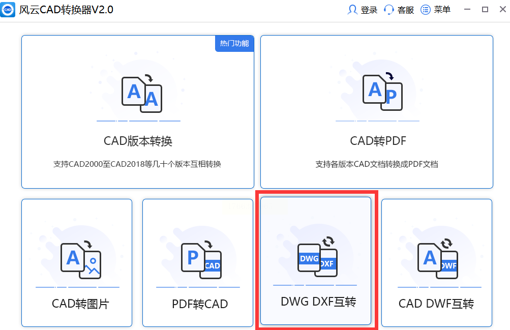 步骤一:打开风云CAD转换器,在主功能列表中选中“DWG DXF互转”。