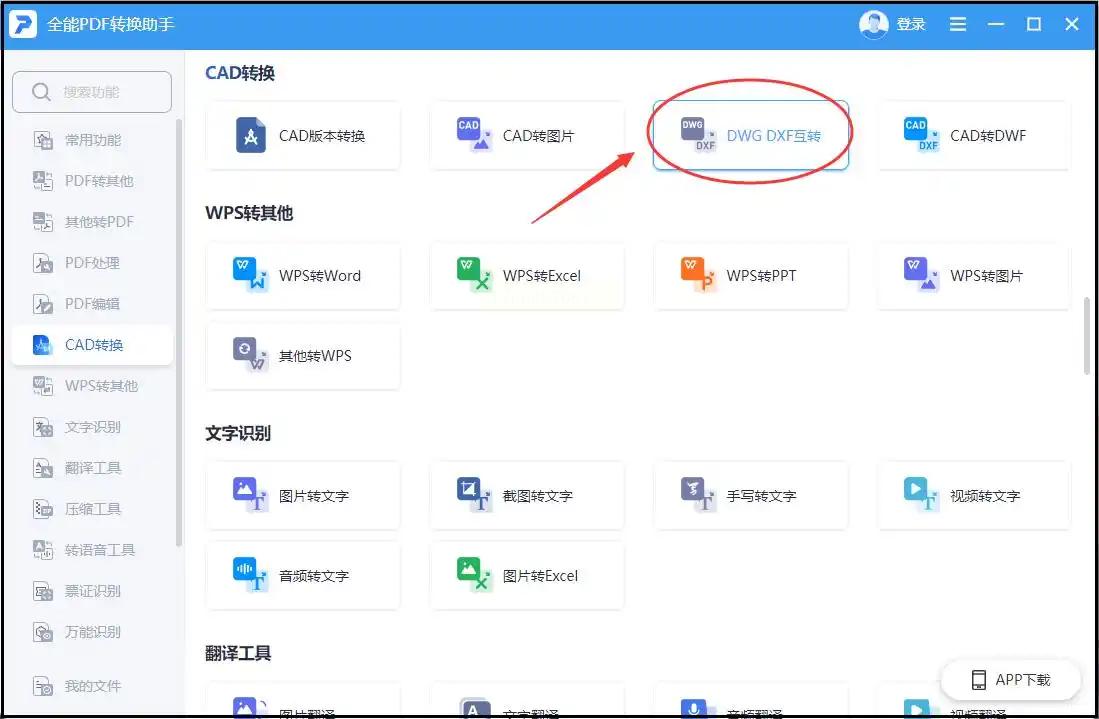 步骤一:打开软件,在侧边栏或功能大厅找到“CAD转换”或类似分类,然后进入“DWG DXF互转”。