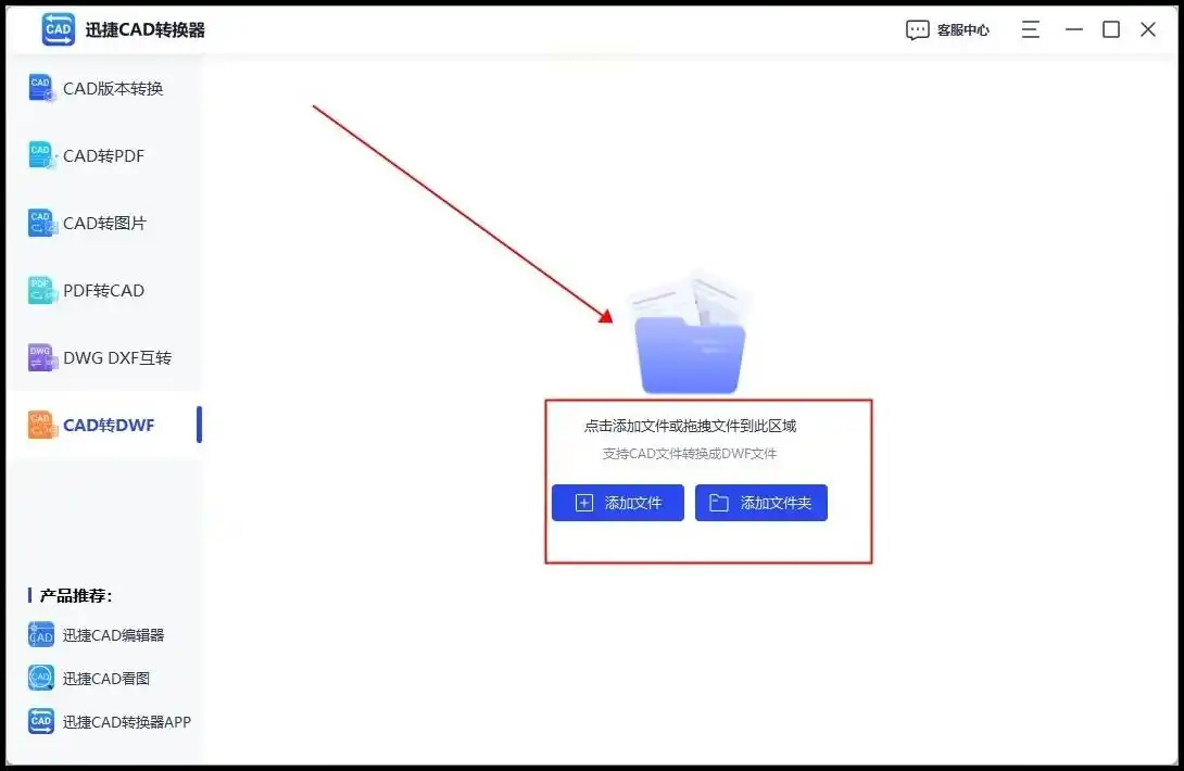 步骤二:点击“添加文件”按钮,把电脑里需要转换的CAD图纸导入进来。
