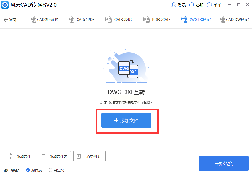 步骤一:启动风云CAD转换器,在功能界面中找到“DWG DXF互转”选项,点击进入。
