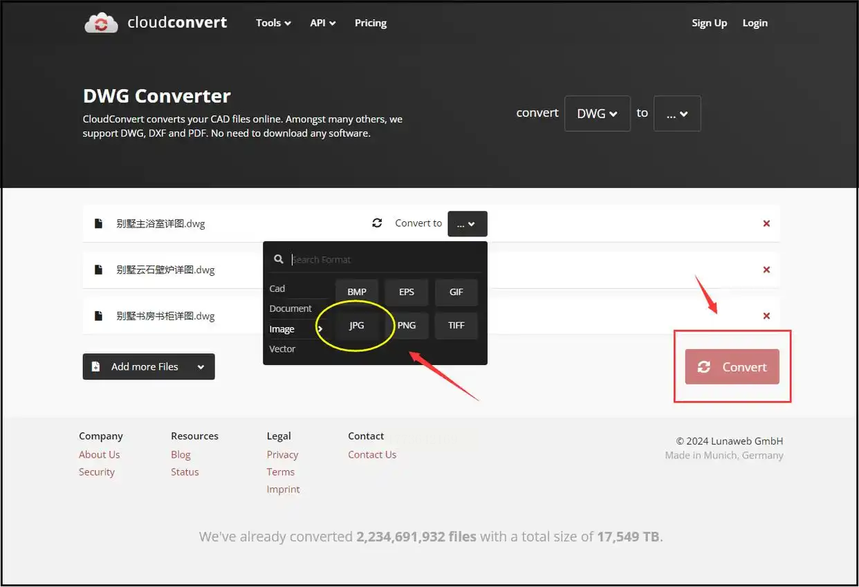 1. 在浏览器中打开CloudConvert官网,在首页找到“选择文件”按钮,上传DWG文件。