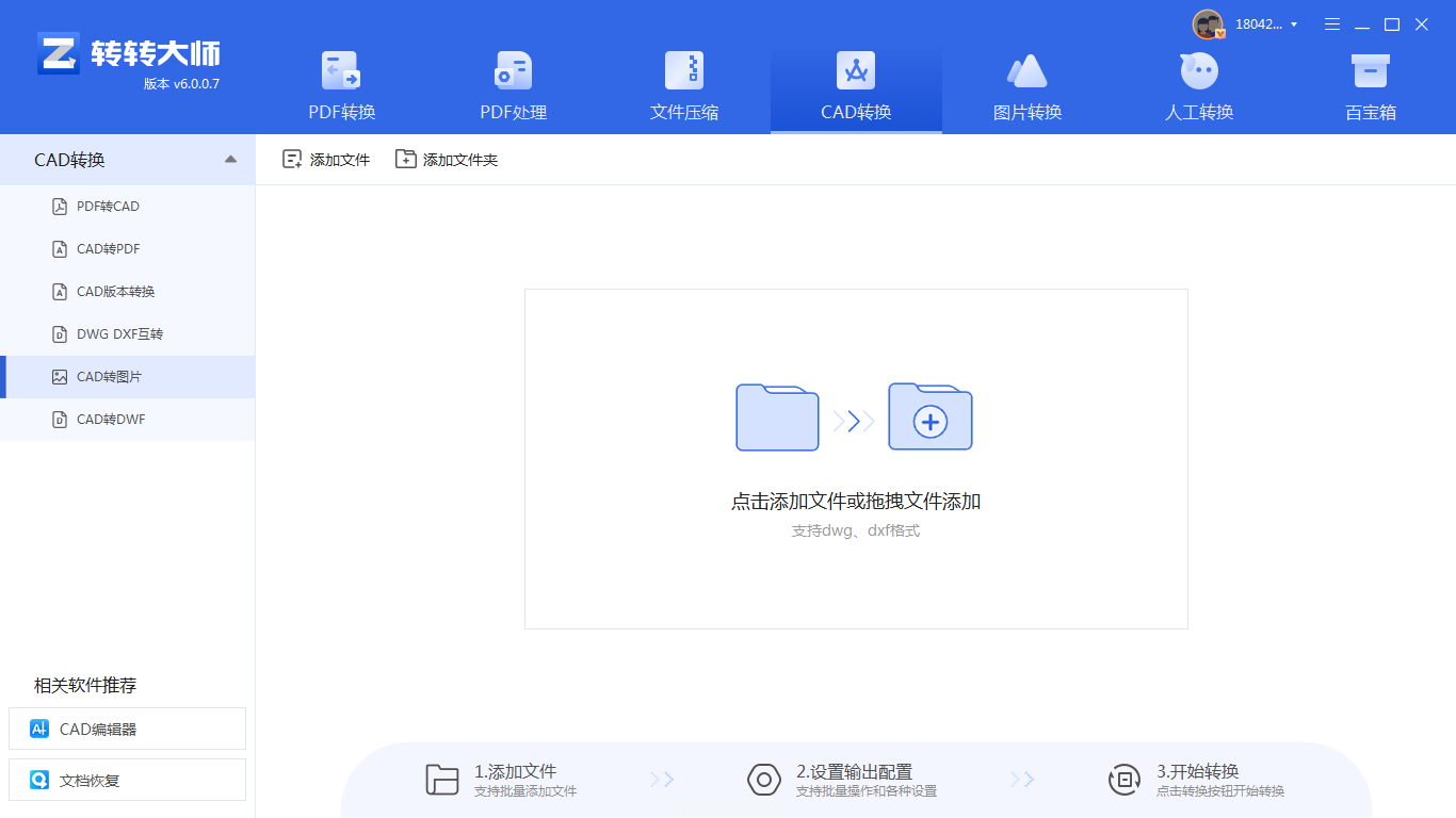 步骤一:下载并安装客户端后打开,在功能列表中定位到“CAD转换”下的“CAD转图片”子项。
