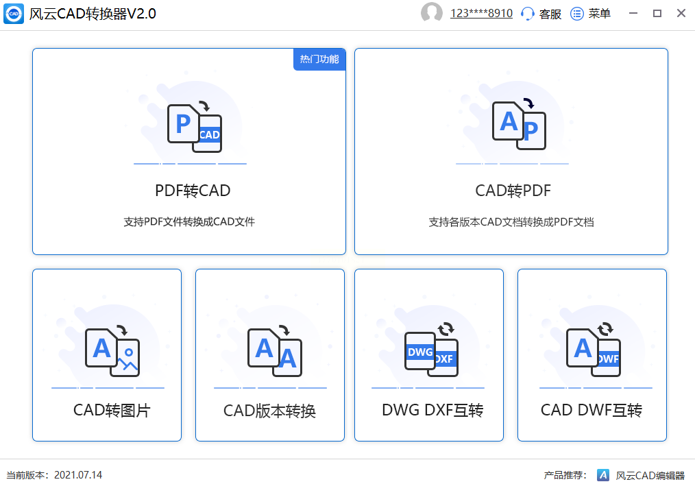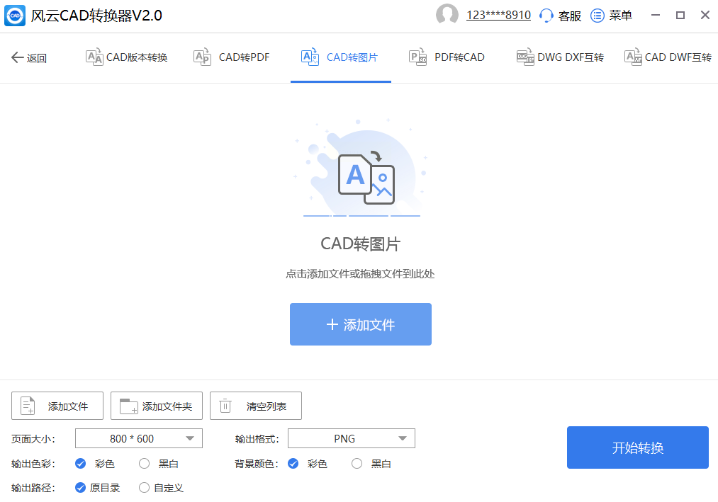 打开软件后,在主界面左侧找到“CAD转图片”按钮点击进入。