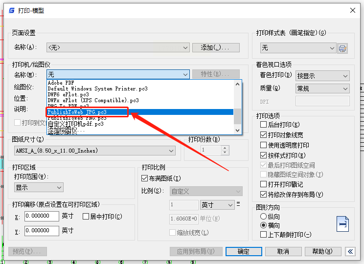 按Ctrl+P打开打印对话框,在打印机名称下拉框中选择PublishToWeb JPG.pc3(这个虚拟打印机就是专门生成JPG的)。