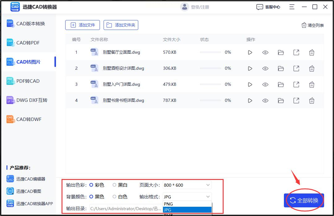 步骤一:打开软件后,在主界面选择“CAD转图片”功能,然后上传需要转换的CAD文件。软件支持批量操作,可以一次添加多个文件。