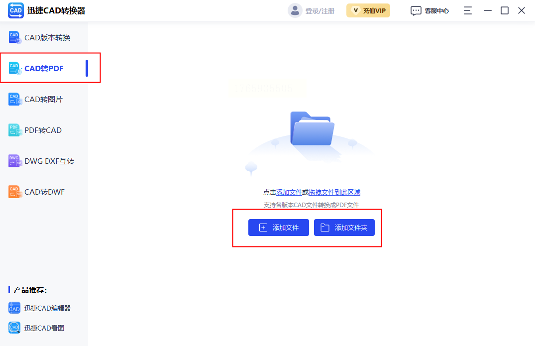 步骤二:通过点击“添加文件”按钮,或将需要转换的CAD文件直接拖拽到软件窗口指定区域,来导入你的图纸。这款软件支持一次性添加多个文件进行批量操作。
