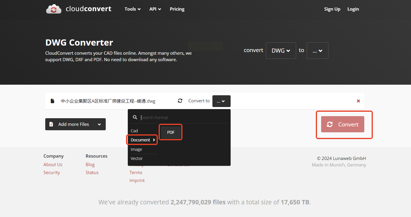 步骤二:在网站页面上找到并点击“选择文件”或“上传”按钮,从你的电脑中选中需要转换的DWG或DXF格式的CAD图纸。