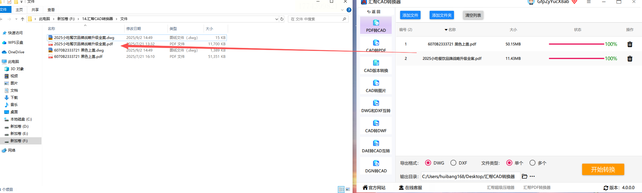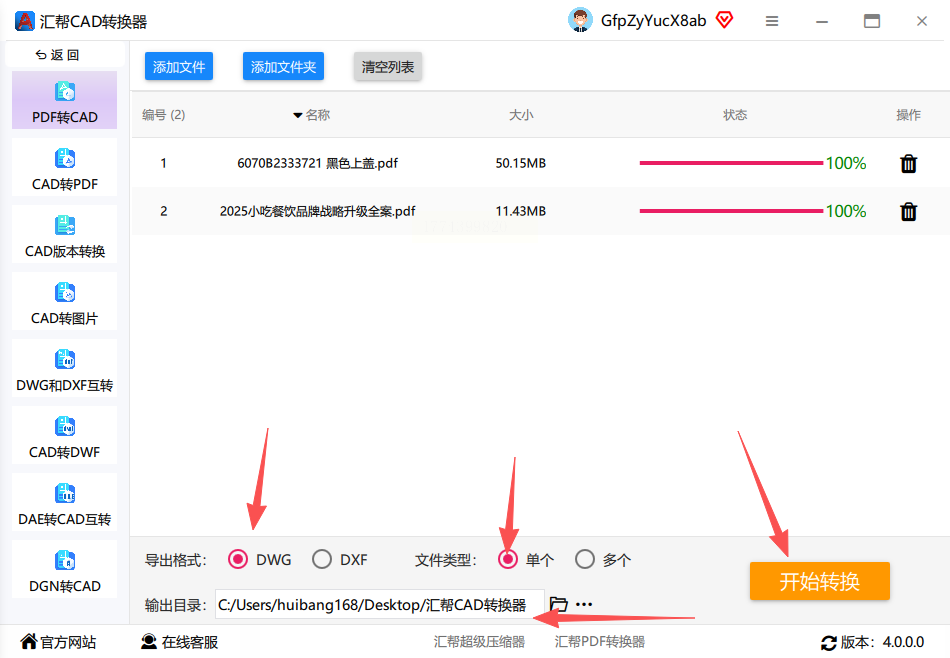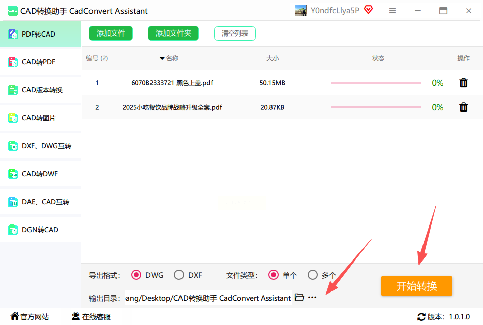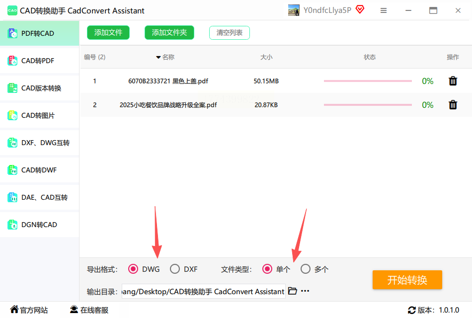 4. 选好保存路径(比如设为桌面文件夹),点“开始转换”,快速完成pdf转dwg