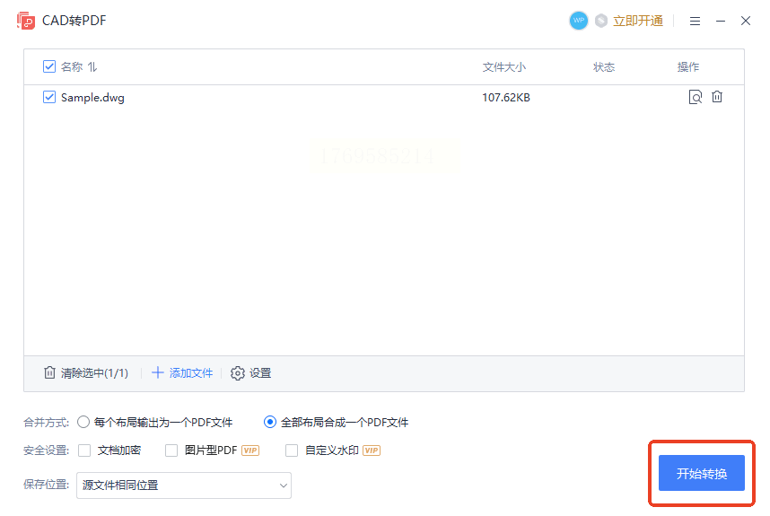 4. 所有参数确认无误后,点击“开始转换”按钮,等待进度条走完即可。转换过程中会保留原始CAD文件,新生成的PDF文件会直接出现在指定目录。