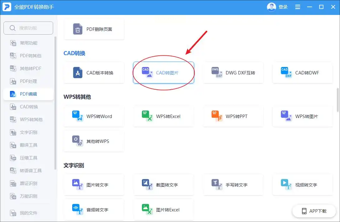 打开软件后,在左侧功能栏找到“CAD转换”分类,点击“CAD转图片”选项。