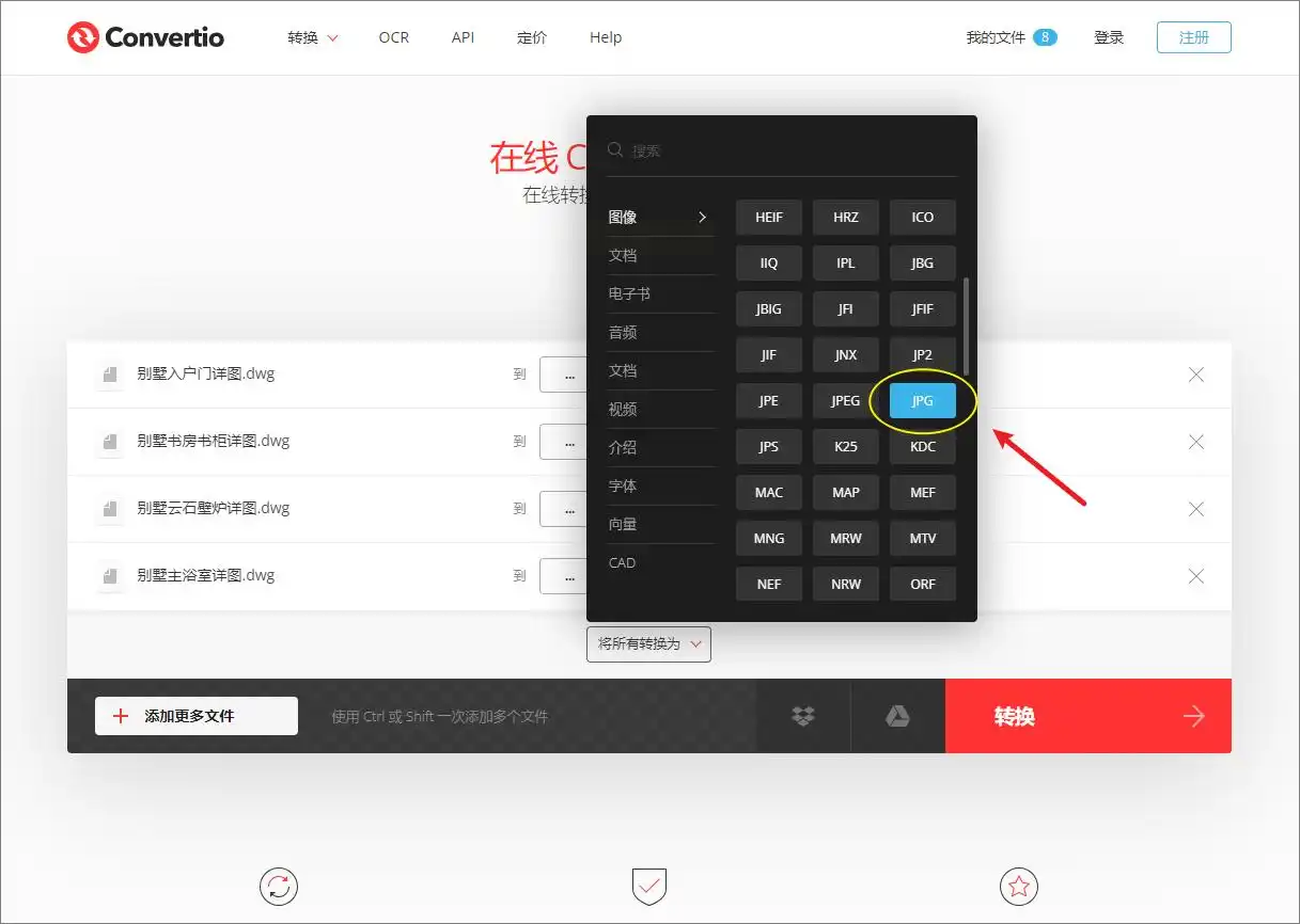 - 步骤:访问Convertio官网,点击“上传文件”导入CAD图纸,选择目标格式(如PNG),点击“转换”按钮。