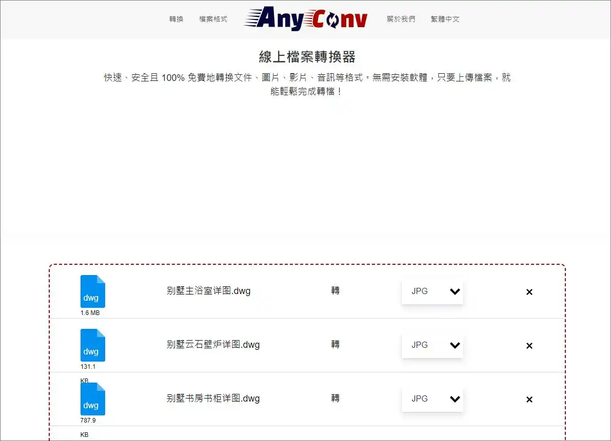 - 步骤:打开网页版AnyConv(无需下载软件),点击“选择文件”上传CAD图纸,选择“JPG/PNG”格式,点击“转换”。