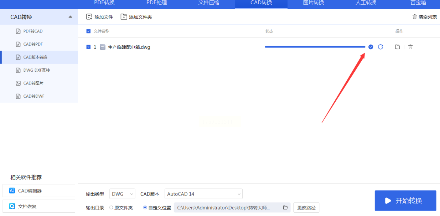 2. 功能区导航:主界面左侧找到"CAD版本转换",点进去后界面会变成一个文件列表窗口。