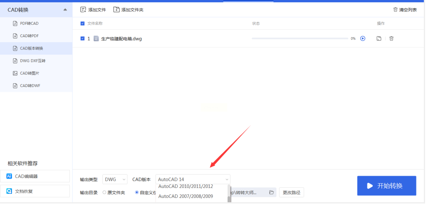 4. 版本设置:上方有个"输出版本"的下拉框,选好你要的版本后,还能在右边设置"输出路径",想把转换后的文件存在哪个盘,直接指定就行。