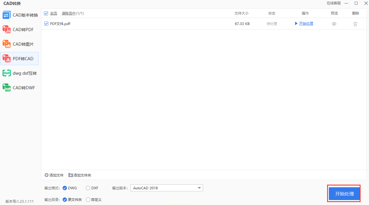 步骤四:直接点击“开始处理”,软件会生成临时CAD文件后自动转为dwg,状态栏显示“转换任务队列”。