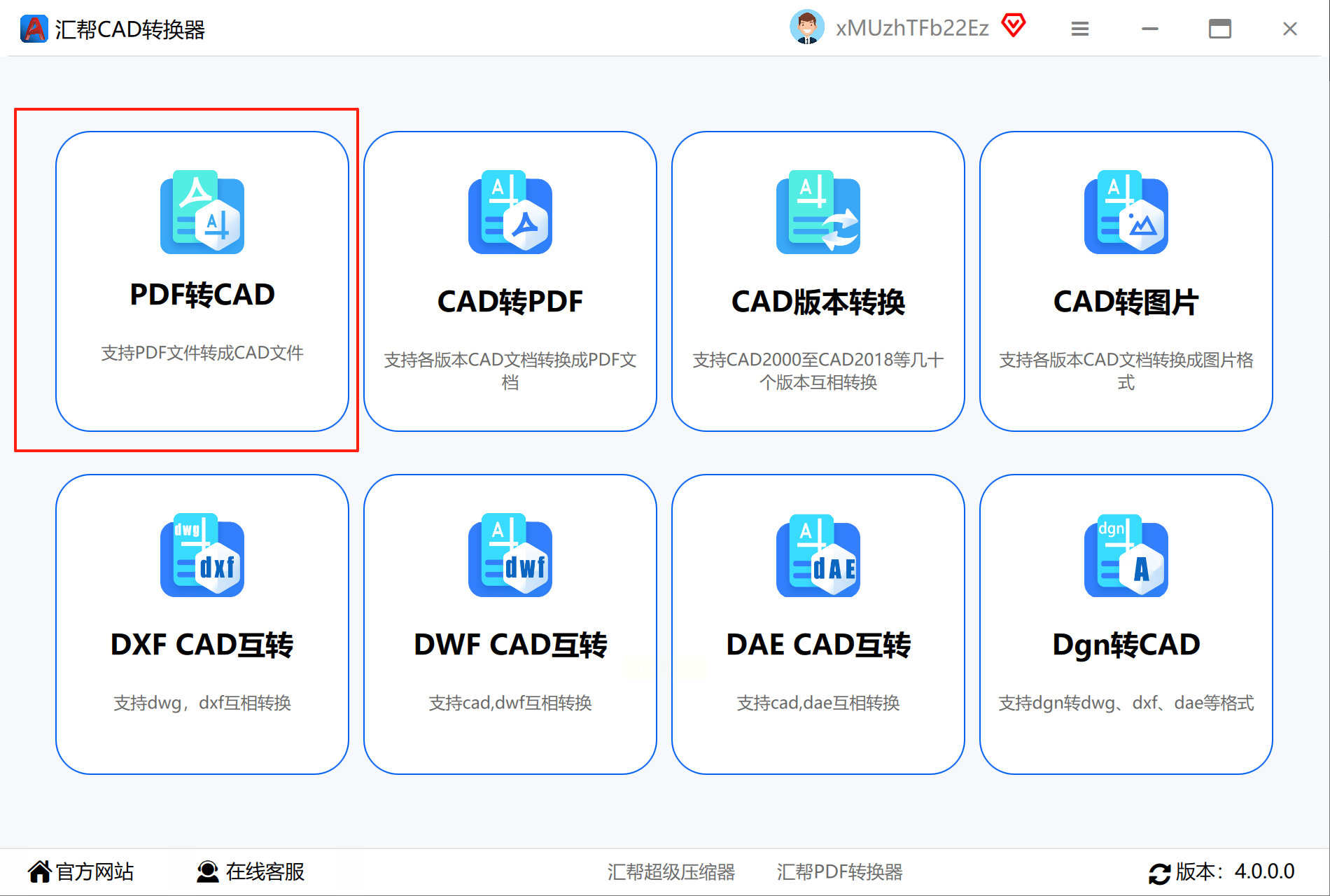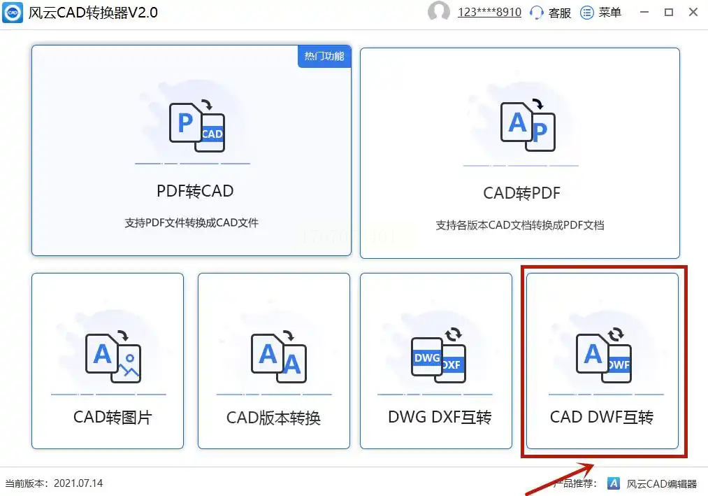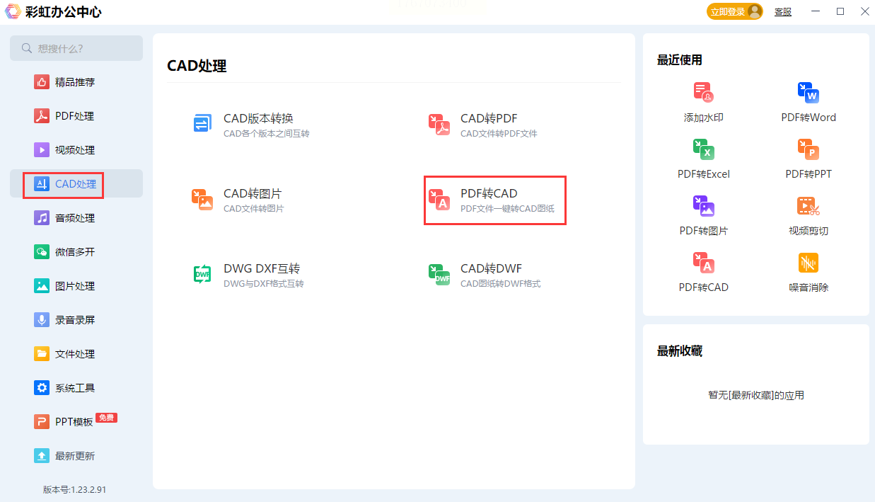 步骤一:打开软件后,在“文件格式转换”区选择“PDF转CAD”(注意区分“CAD DWF转换”模块,避免混淆)。