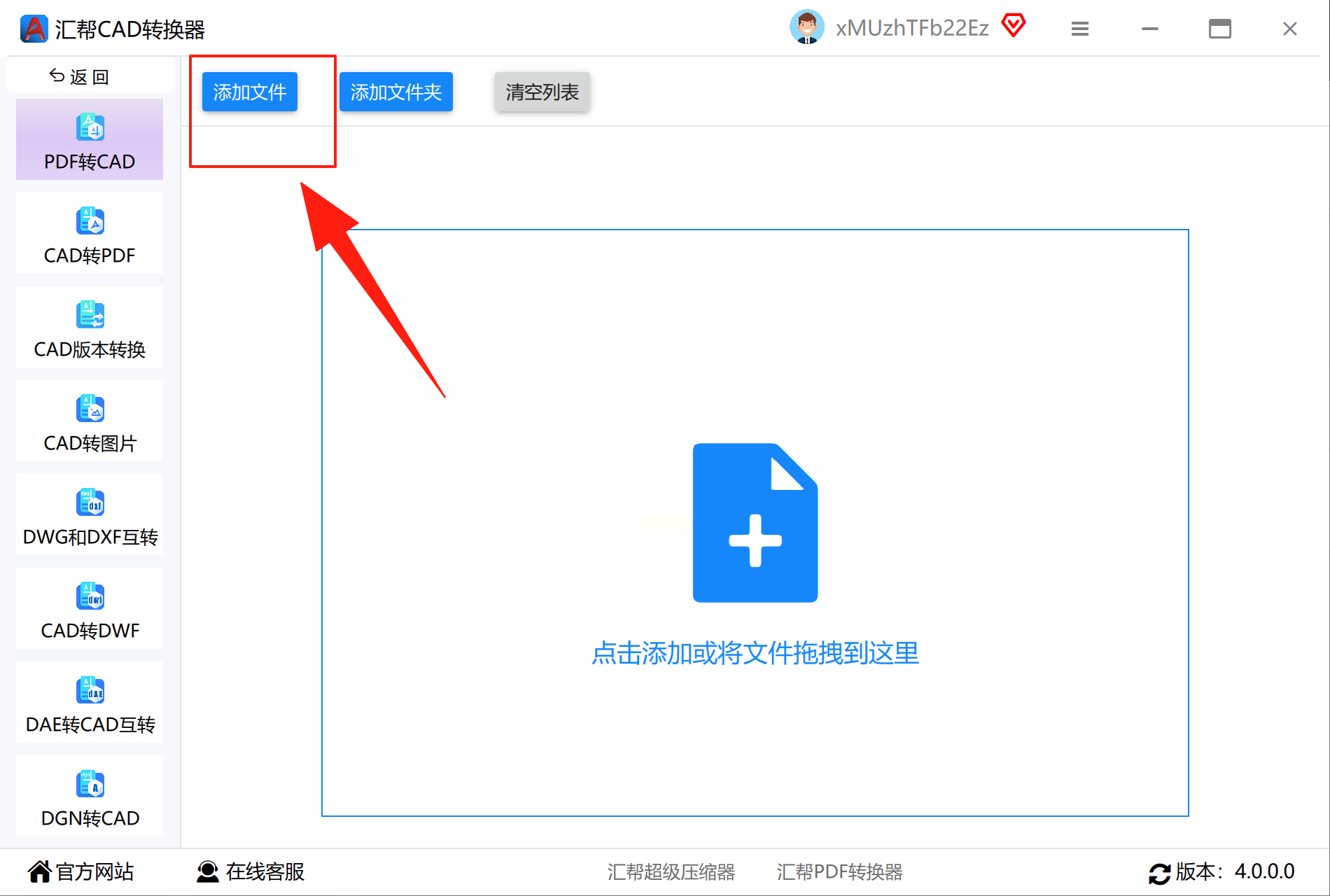 步骤二:进入“PDF转CAD”子菜单,在文件区域点击“+”号添加PDF,支持PDF/A格式直接导入。