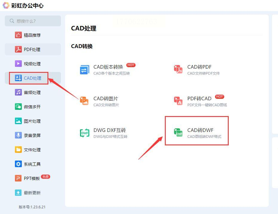 步骤一:在软件左侧找到“CAD处理”分类,点击展开后选择“CAD转DWF”功能。