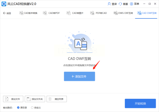 步骤二:点击“添加文件”,从电脑中选取要转换的CAD图纸。这里同样支持多文件同时导入。