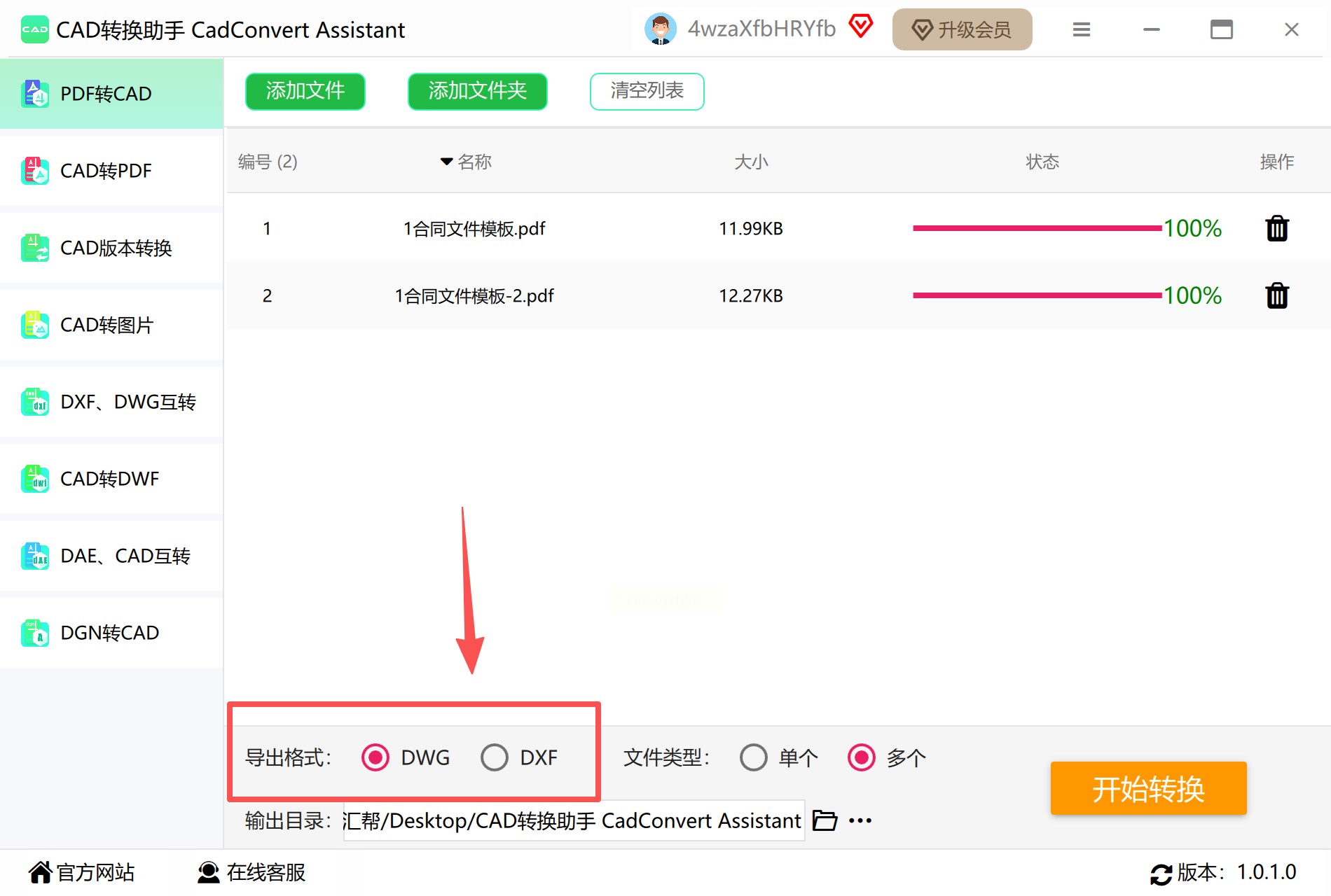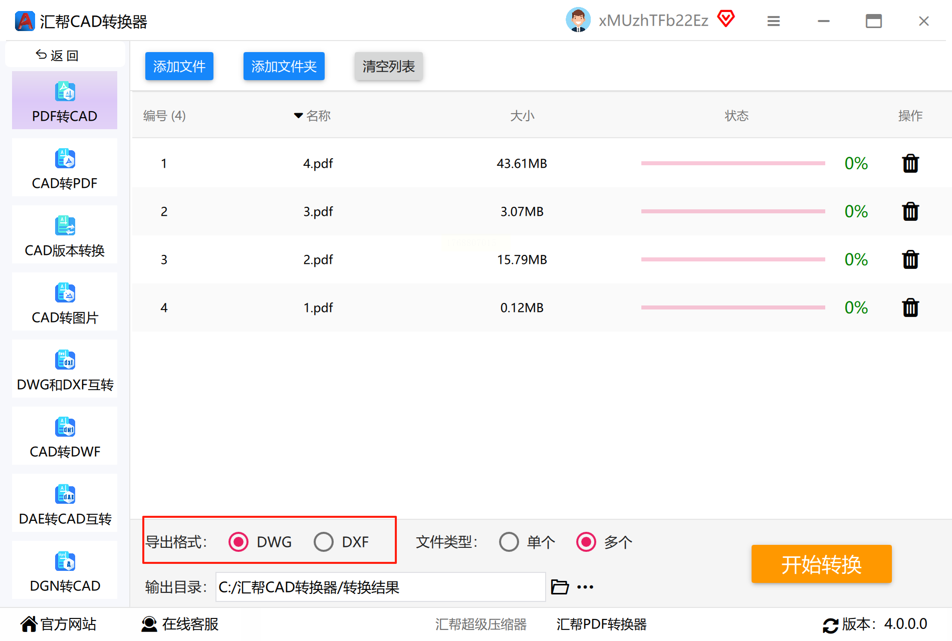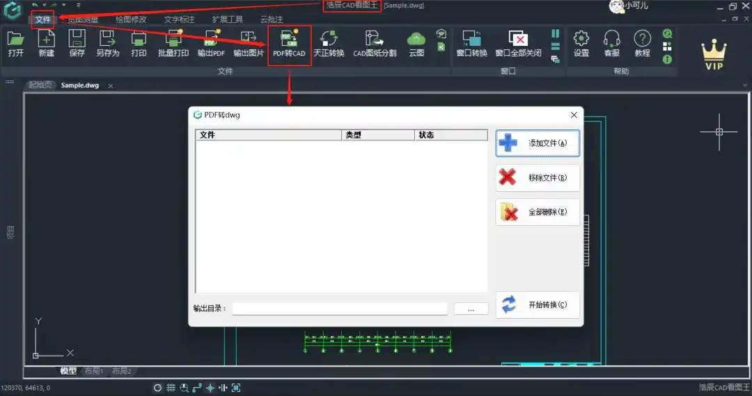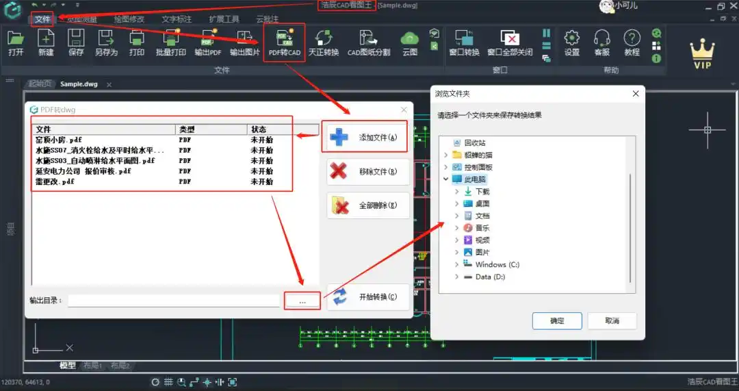 步骤二:这会启动一个转换器界面,点击“添加文件”导入PDF图纸,然后选择输出格式(DWG或DXF),最后点击“开始转换”。