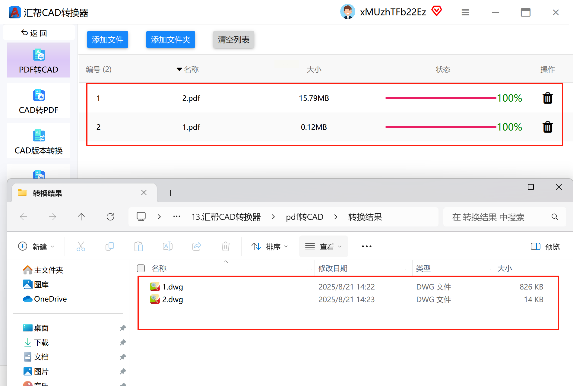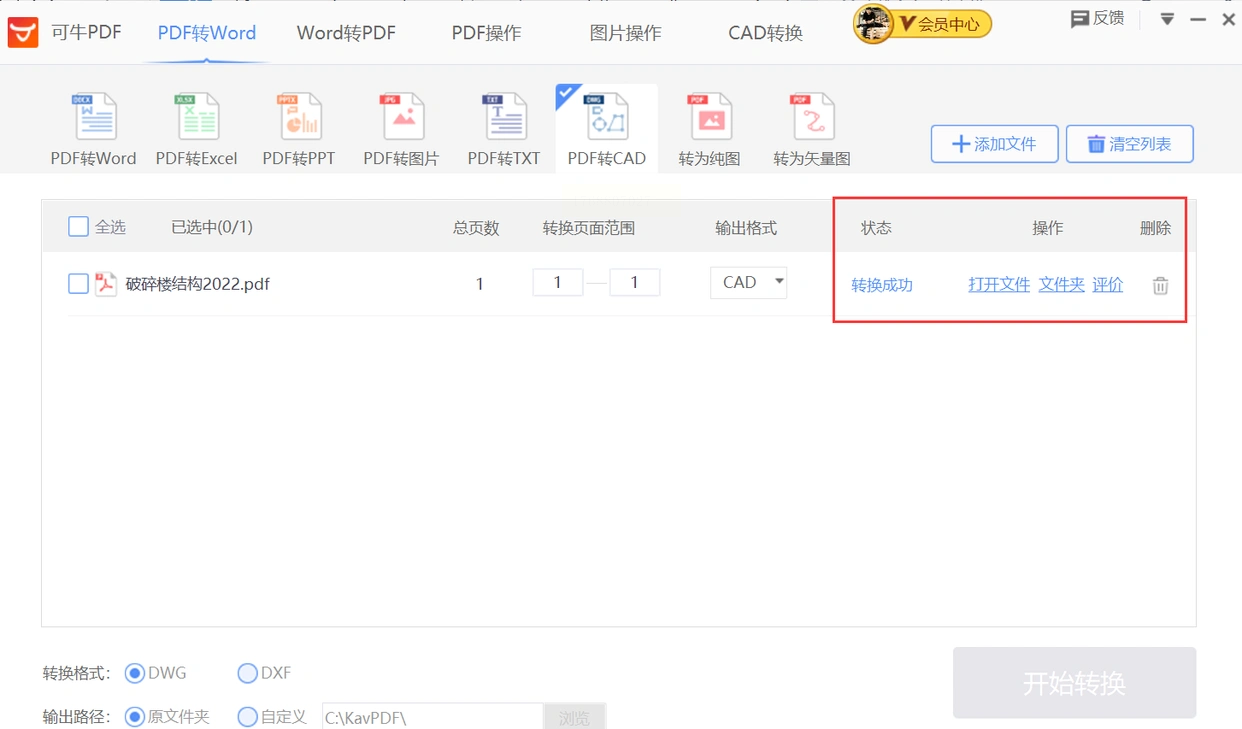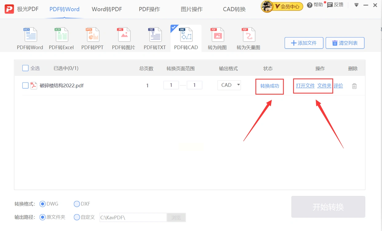 步骤三:转换状态会实时显示,成功后点击“打开文件”或“打开文件夹”,即可用你的CAD软件查看结果。