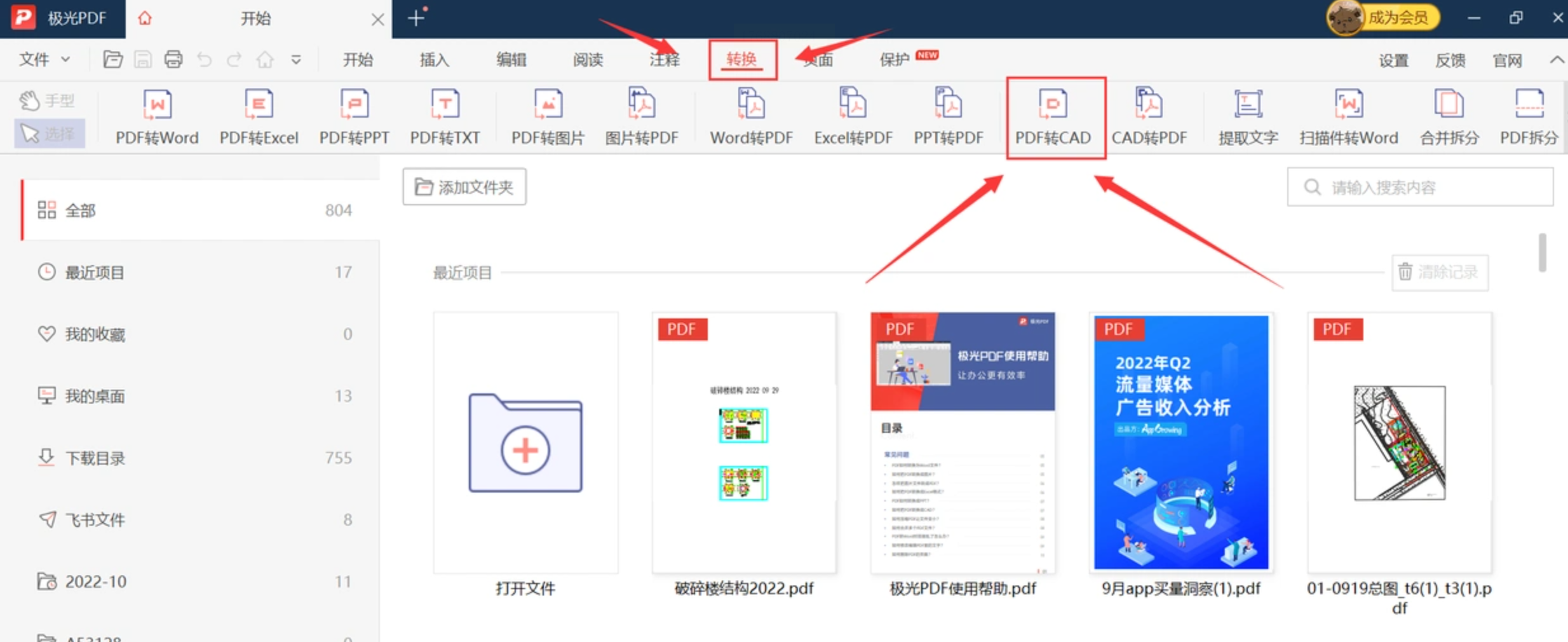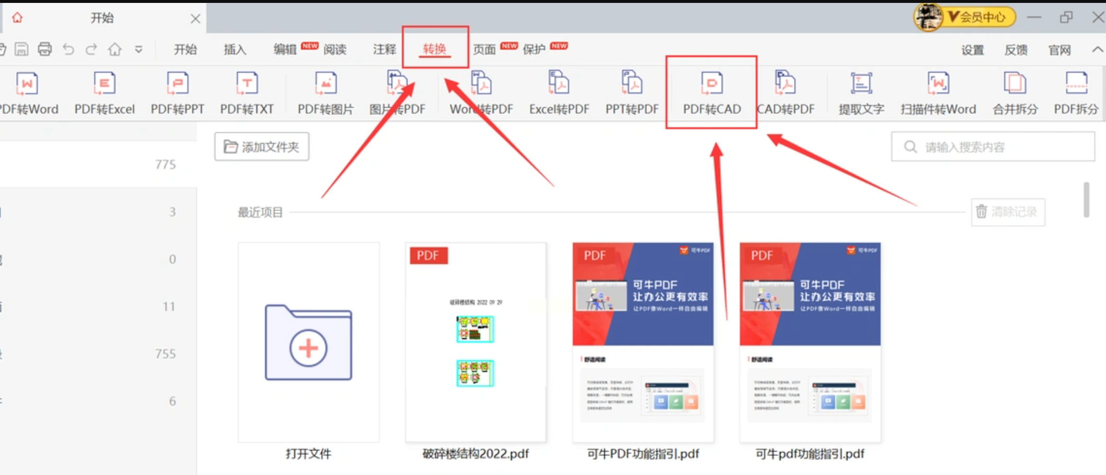 步骤一:安装并打开软件,在工具栏找到“转换”菜单,选择其中的“PDF转CAD”选项。