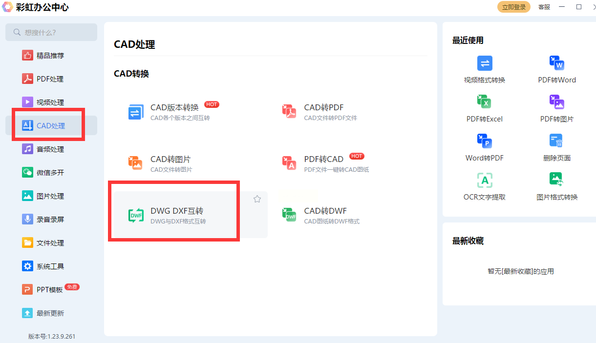 1. 功能定位:在办公软件界面找到"CAD处理"模块,点击进入后选择"DWF转DWG"。