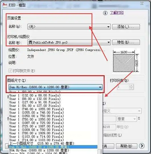 - 选择【打印机/绘图仪】为“JPG.PC3”(系统自带的虚拟JPG打印机);