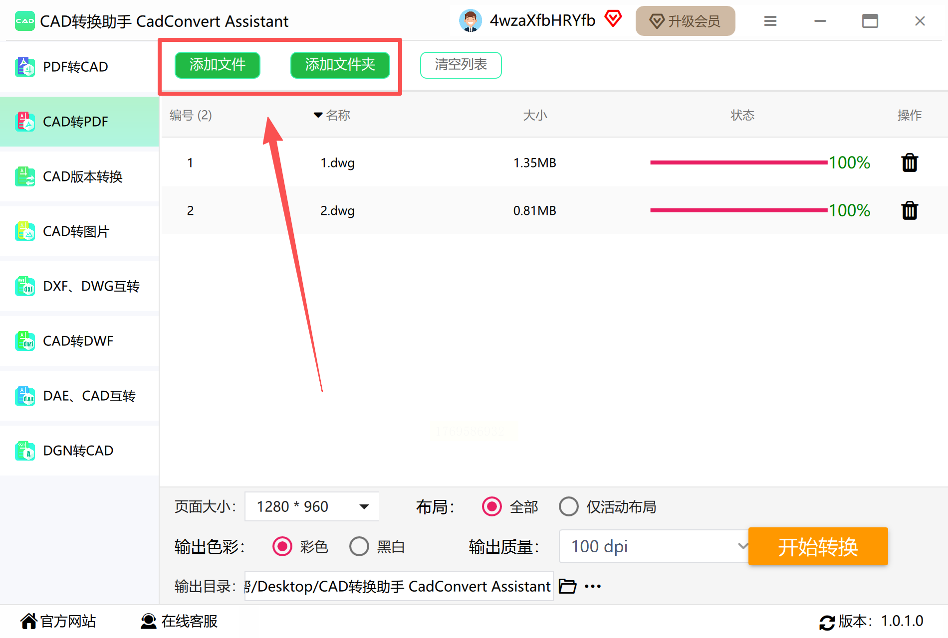 支持拖拽功能,将多个CAD文件拖入界面即可,也可通过"添加文件"按钮逐个选择。这里需要注意,导入时软件会自动预览文件缩略图,方便确认文件是否正确添加。