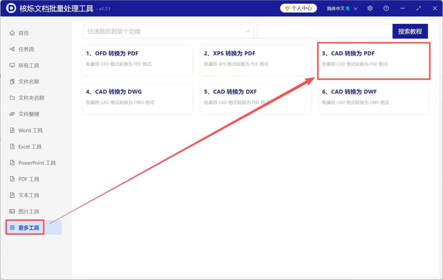 这款工具主打"零技术门槛",非常适合需要处理大量CAD文件的场景。打开软件后,在"更多工具"菜单中找到"CAD转换为PDF"选项,界面简洁明了,三步即可完成转换: