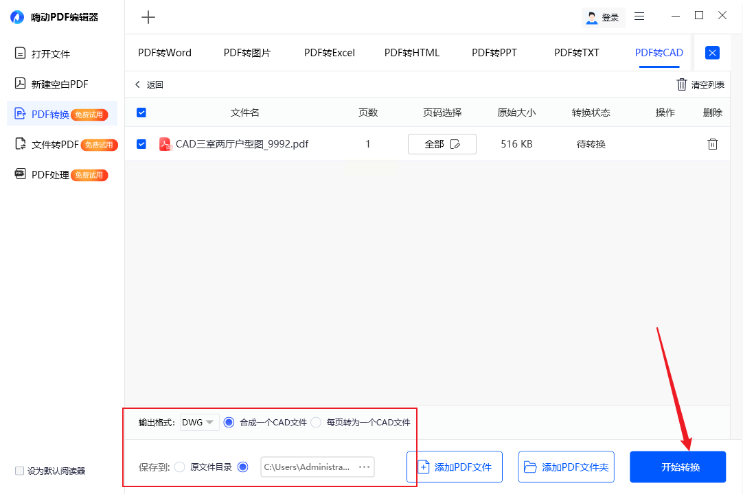 2. 点击"PDF to DWG"选项,上传目标文件