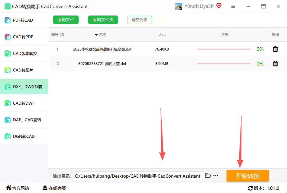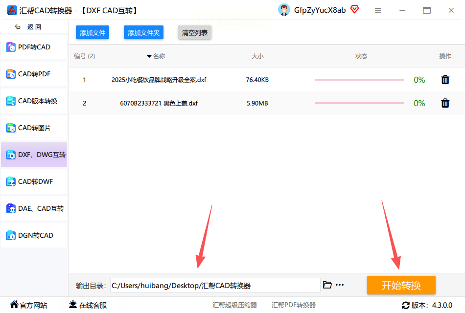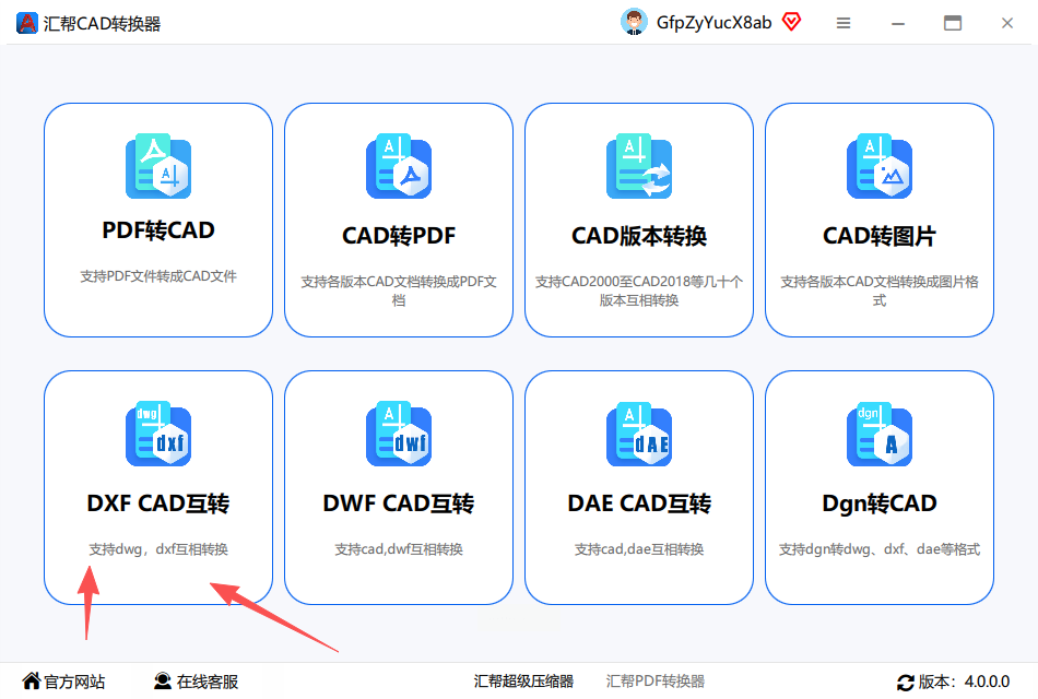 1. 进入界面:打开软件后,左侧功能栏选择“DXF CAD互转”,右侧出现文件上传区域。
